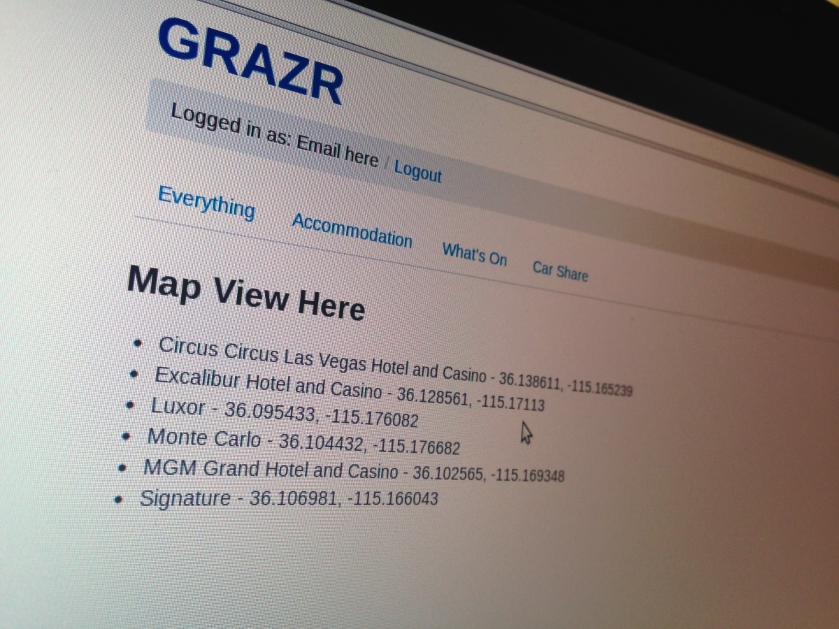 It was challenging but we did make some great progress in the morning.  Authentication was up and running with Facebook along with the ability to post content.  Haro did some sterling work in getting MapBox integrated into the application to display hotel details in around the Las Vegas area.  The hotel data itself was to be added manually (I had collated the hotel details the night before in a Google Spreadsheet) but obviously this wasn't the most ideal solution but for now it would suffice.