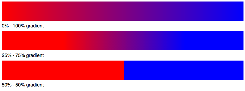 The key is that the CSS gradient specification uses "colour stops" to define where on the gradient the shade should change. Typically you would specify 0% and 100% as your stops to give a smooth gradient from one side of the element to the other. But if you bring those figures together - say 25% and 75% - you get a smaller gradient with flat colours either side. And if you put two colour stops in the same place? You get an immediate change from one to the other.