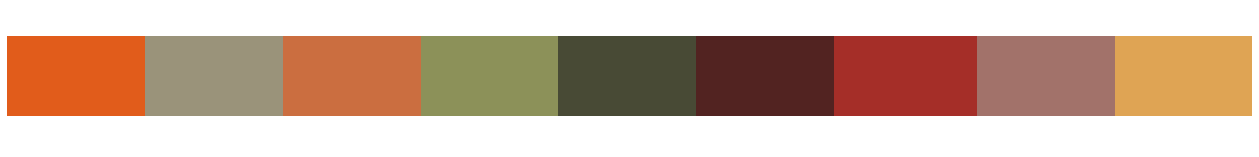 background: linear-gradient(to right, #e15c1b 11%, #9a937a 11%, #9a937a 22%, #cb6e40 22%, #cb6e40 33%, #8c9159 33%, #8c9159 44%, #484a35 44%, #484a35 55%, #522321 55%, #522321 66%, #a52e28 66%, #a52e28 77%, #a2726a 77%, #a2726a 88%, #dfa454 88%);