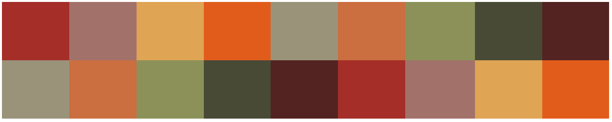 background: linear-gradient(to right, #a52e28 11%, #a2726a 11%, #a2726a 22%, #dfa454 22%, #dfa454 33%, #e15c1b 33%, #e15c1b 44%, #9a937a 44%, #9a937a 55%, #cb6e40 55%, #cb6e40 66%, #8c9159 66%, #8c9159 77%, #484a35 77%, #484a35 88%, #522321 88%), linear-gradient(to right, #9a937a 11%, #cb6e40 11%, #cb6e40 22%, #8c9159 22%, #8c9159 33%, #484a35 33%, #484a35 44%, #522321 44%, #522321 55%, #a52e28 55%, #a52e28 66%, #a2726a 66%, #a2726a 77%, #dfa454 77%, #dfa454 88%, #e15c1b 88%);