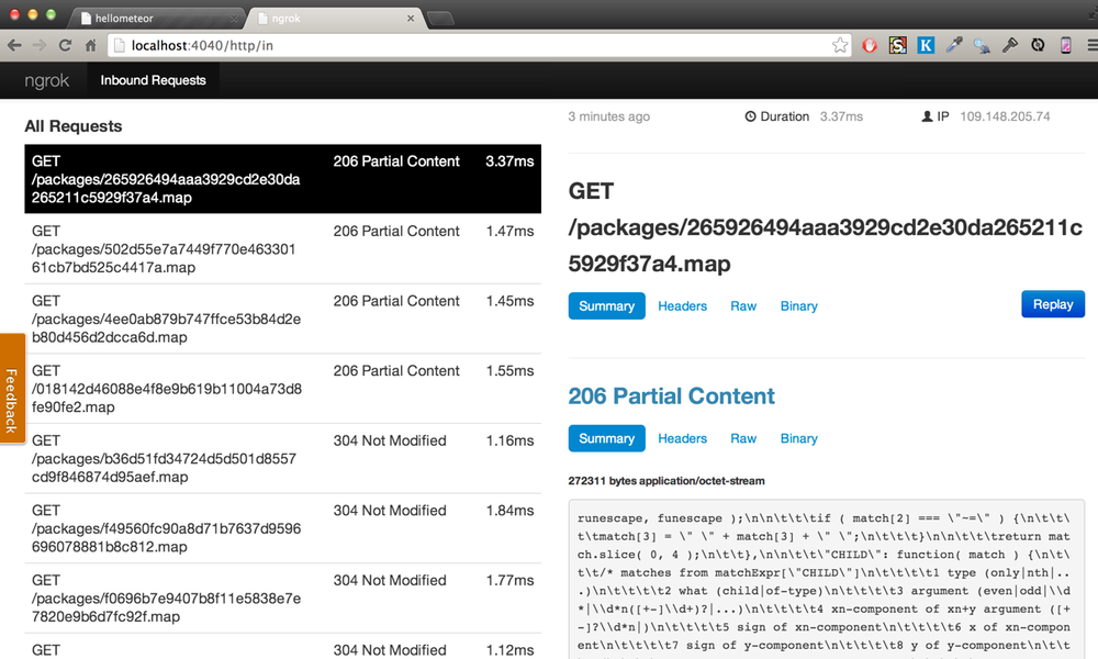 Ngrok also provides you with traffic analyser, available on http://localhost:4040/. In addition to console log, you can view in real time how packets are requested and sent, as well as dig into the packets for more curious details.