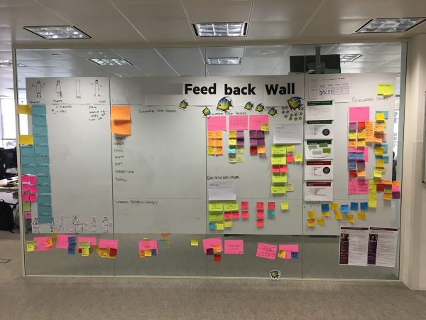 A photo of the feedback wall covered in post it notes