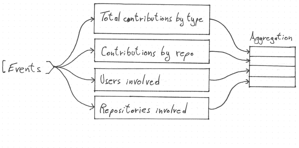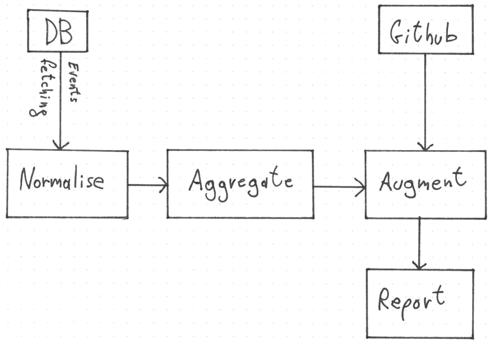 When a report creation is triggered, the events, of the time range specified, are fetched and passed into the normalisation phase. It filters the events not needed and normalises the rest. The normalisation gives us a smaller and a standard set of information that don't depend on the GitHub's event schema.
